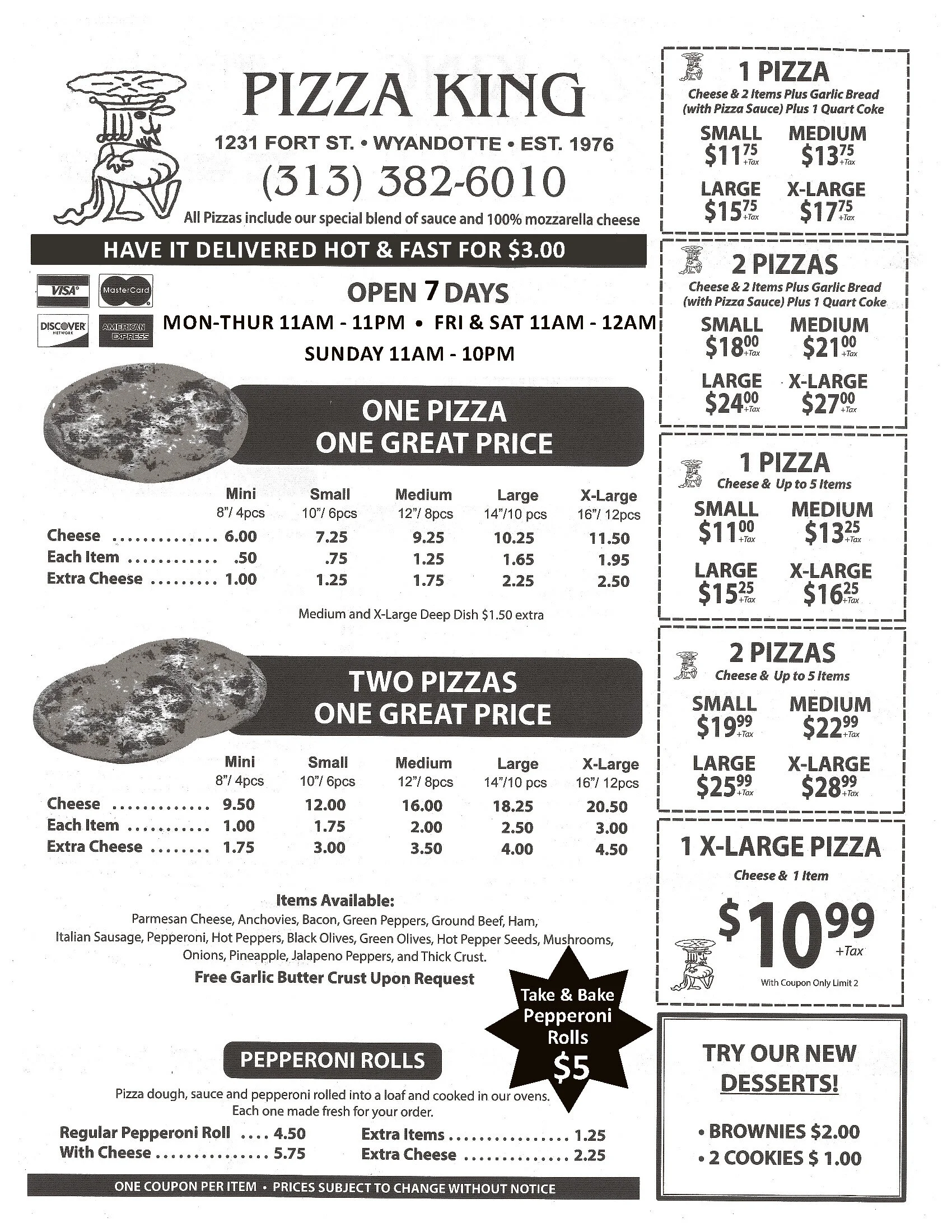 Mickeys Pizza 3511 Fort Street Lincoln Park MI 48146 Ph. Get the latest Pizza King menu and prices. Hours may change under current circumstances.